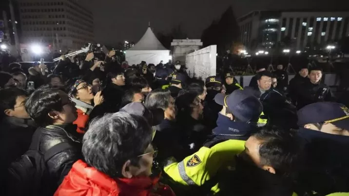 После объявления президента возле парламента Южной Кореи в Сеуле собрались протестующие. Вскоре там произошли первые стычки с военными. Лидер оппозиционной «Демократической партии» Ли Джэ Мен назвал военное положение «неконституционным».