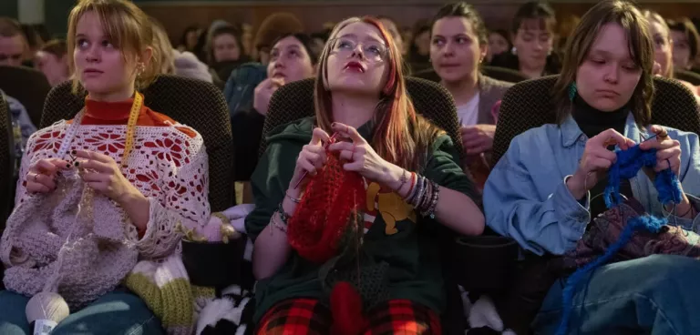 Хотя на первый взгляд в этом кинотеатре нет ничего необычного, но если присмотреться, то можно заметить, что зрители, как женщины, так и мужчины, не только смотрят фильм, но и вяжут носки, шарфы и даже свитеры. Вопреки стереотипам, вязание популярно не только у старшего поколения, но и у молодежи.
